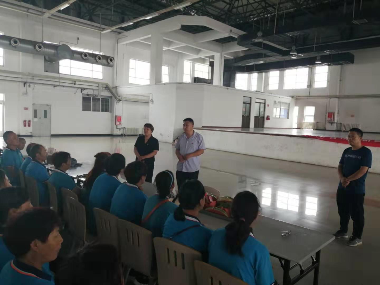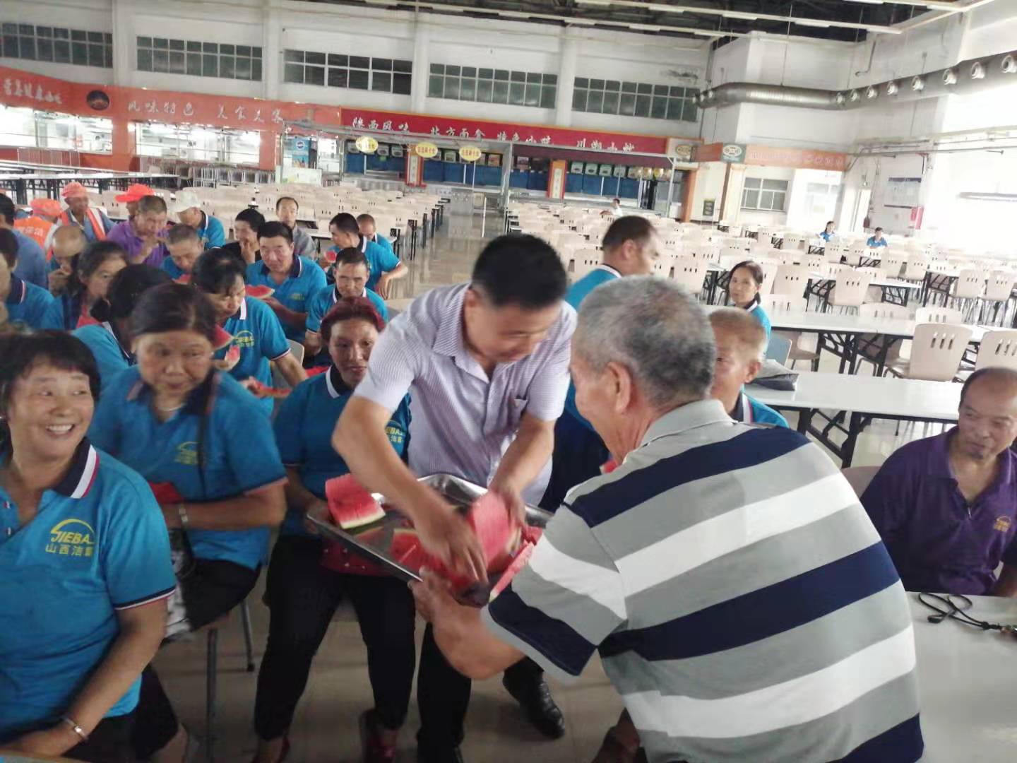 在富士康餐廳二樓,利用工作人員切西瓜的間隙,公司總經(jīng)理程晉軍作了簡(jiǎn)短的講話。他說(shuō),前一段時(shí)間,公司召開(kāi)了“安康杯”勞動(dòng)競(jìng)賽動(dòng)員大會(huì),大家要提高安全意識(shí),始終把安全工作放在心上。他囑托大家在夏季工作中一定要注意防暑,感謝大家在酷暑下依舊兢兢業(yè)業(yè)奮斗在各自的工作崗位上。工會(huì)主席崔偉也作了簡(jiǎn)要發(fā)言,他說(shuō),今年是潔霸公司成立二十周年,希望大家在工作中繼續(xù)發(fā)揚(yáng)潔霸精神,積極樹(shù)立潔霸形象,為公司爭(zhēng)光。
