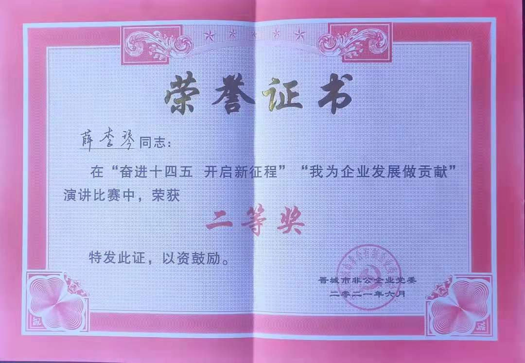 6月2日下午,晉城市非公企業(yè)黨委“奮進(jìn)十四五·開啟新征程 我為企業(yè)發(fā)展做貢獻(xiàn)”主題演講比賽決賽在市市場(chǎng)監(jiān)督管理局6樓視頻會(huì)議室成功舉行。我公司選手薛李琴在決賽中榮獲二等獎(jiǎng)。