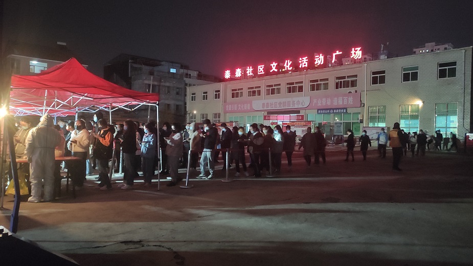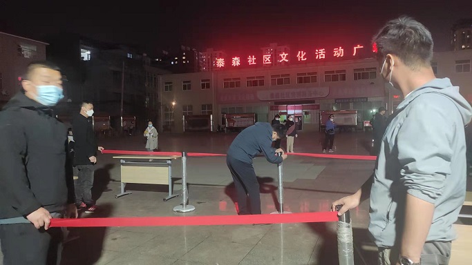 在泰森社區(qū)文化活動廣場,志愿者們擺桌子、拉警戒線、撐帳篷,齊心合力協(xié)助社區(qū)工作人員完成核酸檢測采樣點位設(shè)置及物資配備,同時積極引導(dǎo)社區(qū)居民進行掃碼登記、測量體溫,提醒社區(qū)居民全程佩戴口罩,在排隊期間保持一米間距,組織居民做好分組,提前亮碼,核酸檢測完成后有序離場。雖然天氣較冷,但志愿者們毫無怨言,服務(wù)熱情很高,直至晚上12點,協(xié)助社區(qū)完成了9000余人的核酸檢測工作。