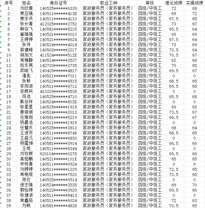 晉城市潔霸清潔服務(wù)股份有限公司職業(yè)技能等級認定中心2024年1月28日第8批家政服務(wù)員中級認定人員成績公示