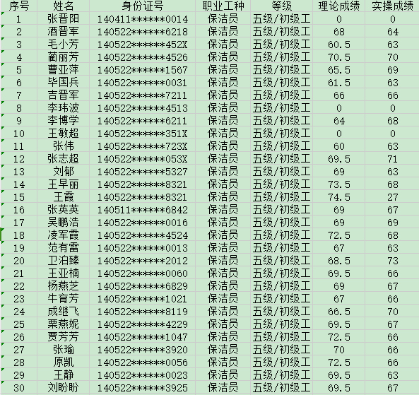 晉城市潔霸清潔服務股份有限公司職業(yè)技能等級認定中心現(xiàn)將2024年8月31日認定人員成績公示如下: